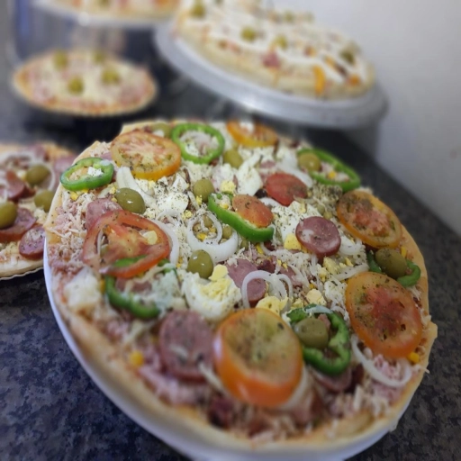 Molho de tomate, mussarela, presunto, calabresa, tomate, cebola...